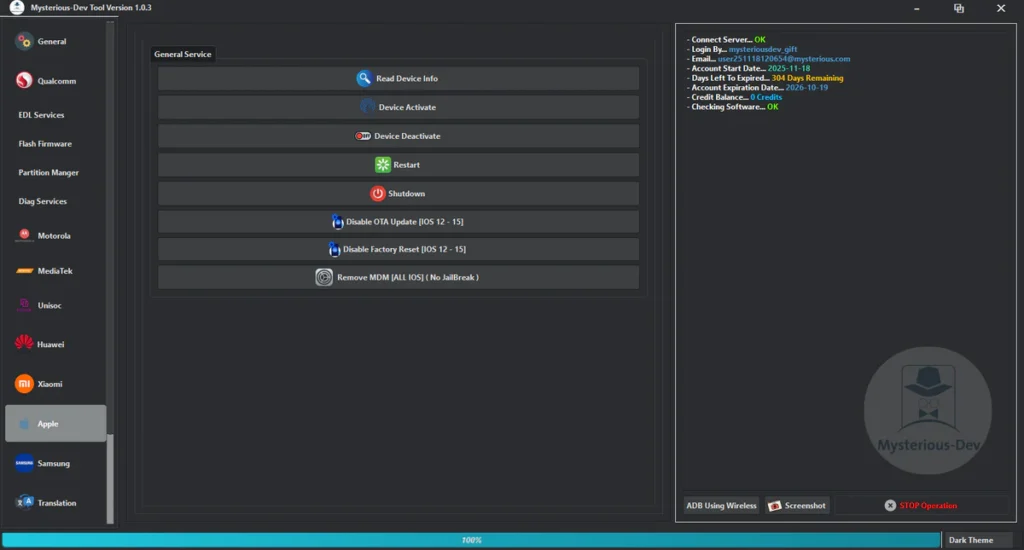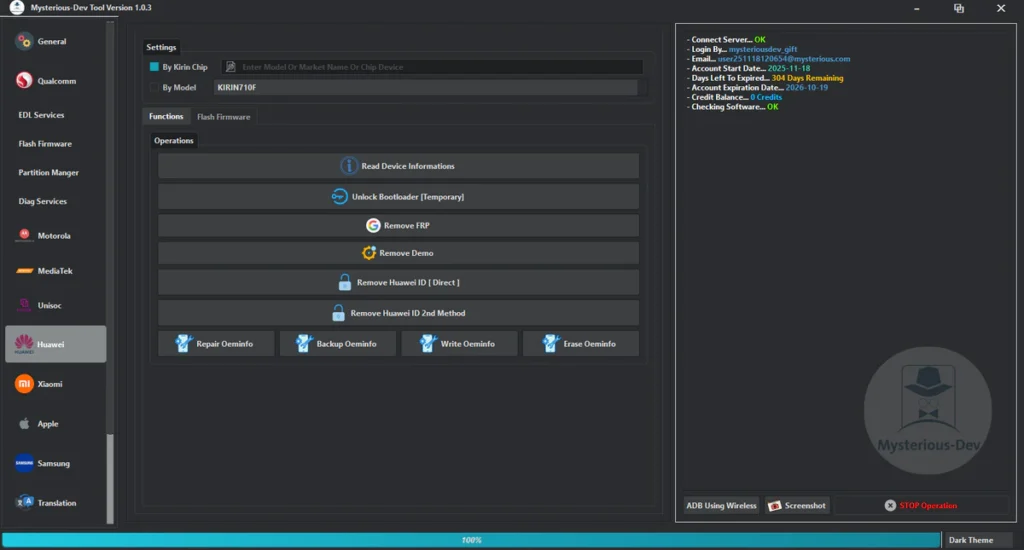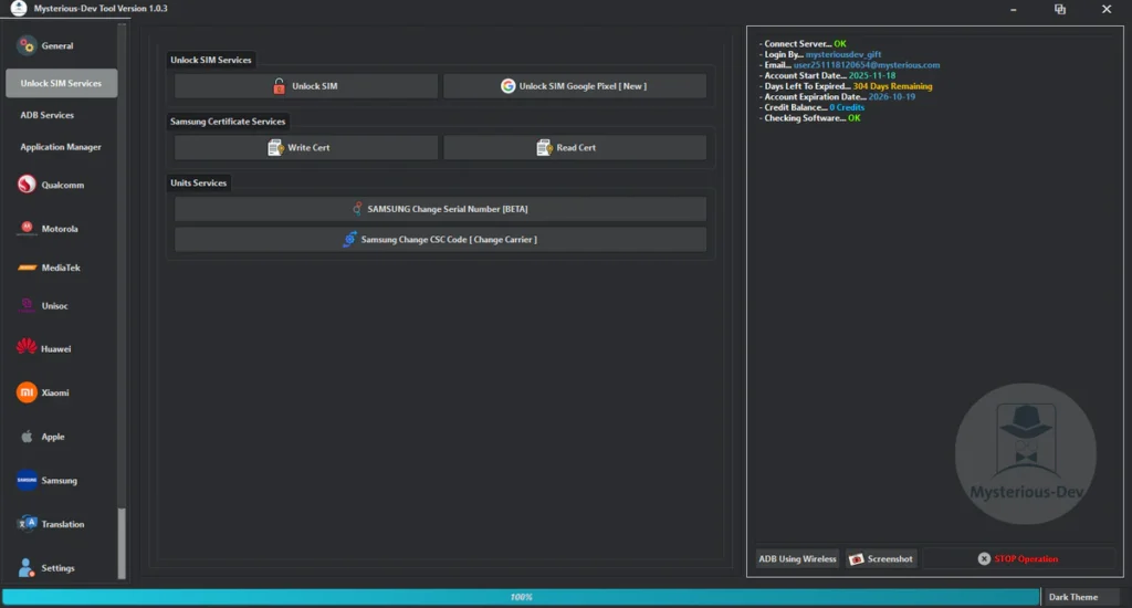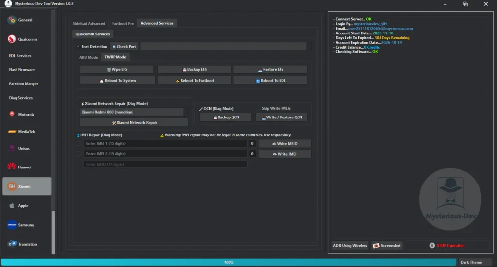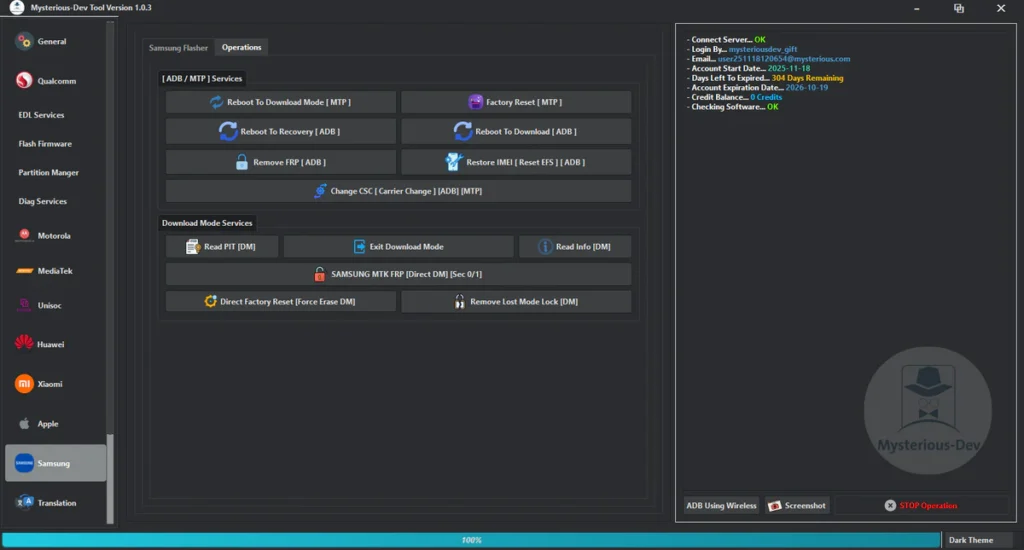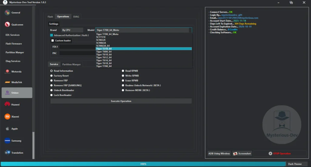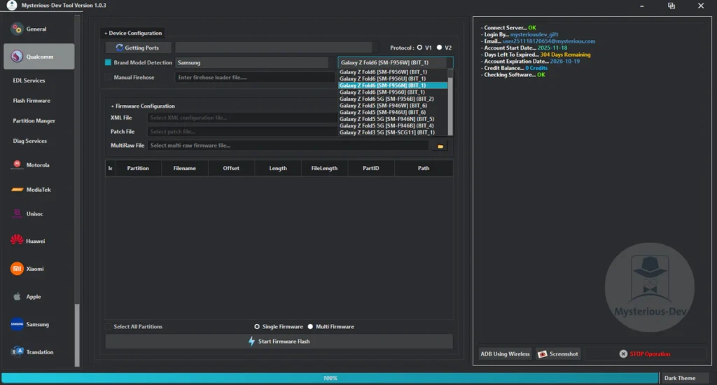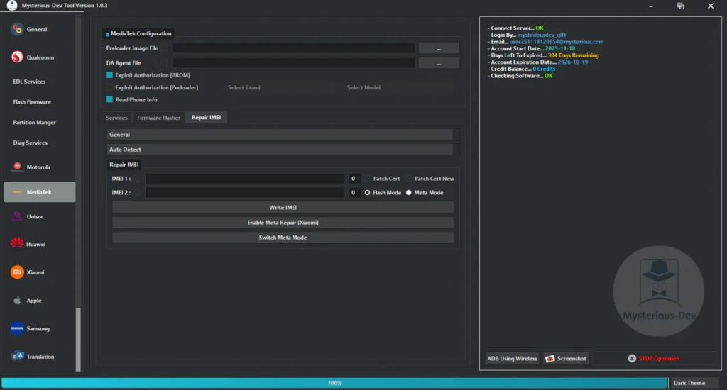 Mysterious-Dev Tool V1.0.3 Free SIM Unlock, Flash Firmware, Partition Manager, Flashing & Repair IMEI & MEID Supports Samsung, Xiaomi, Huawei, & Motorola Works With Qualcomm, MediaTek, & Unisoc Phones